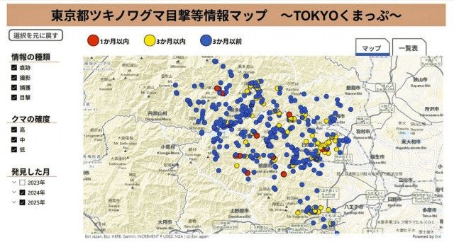 都によると、都内での目撃や痕跡などの情報は2024年度318件、25年度も8月末までで178件に上る。都はスマートフォンでも見られる「都ツキノワグマ目撃等情報マップ~TOKYOくまっぷ~」を昨年2月から公開するなどし、注意を呼びかけている。