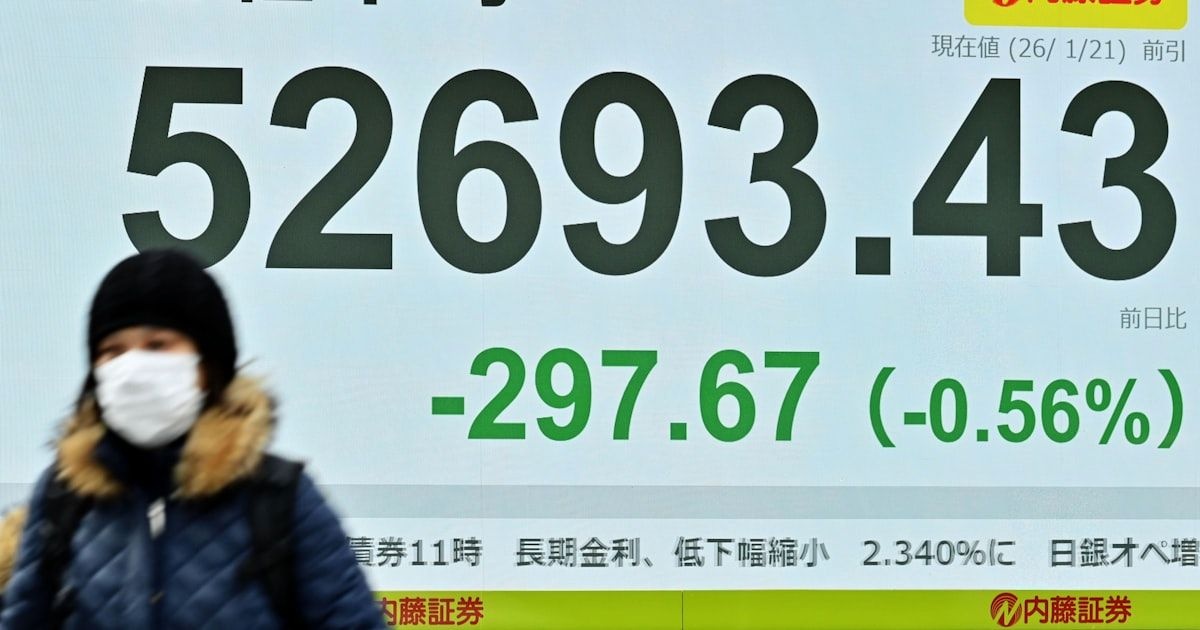 東京株式市場で日経平均株価は5日続落し、午前の取引終了時点で前日比297円67銭(0.56%)安の5万2693円43銭となった。デンマーク自治領グリーンランドを巡る米欧の対立から前日の米国株式市場で株安が進み、地政学リスクに伴う売りが国内にも波及した。足元の国内金利急騰で金融機関が保有する円債の含み損が膨らむとの懸念も広がり、銀行や保険などの金融株がこぞって売られた。