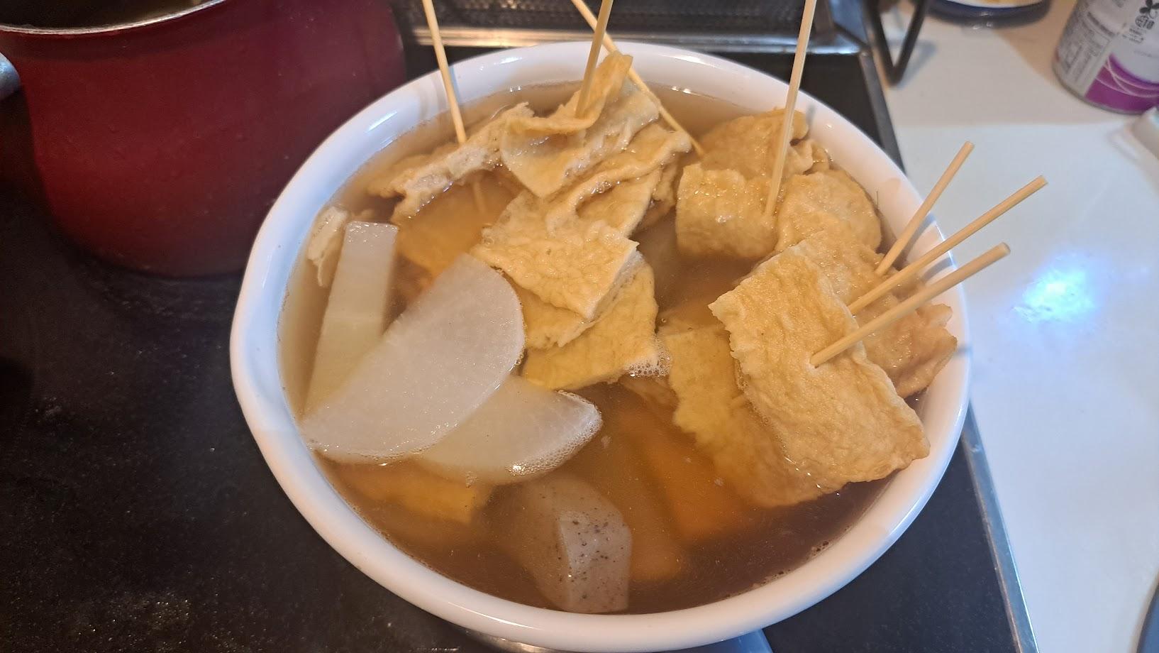 串におでんを刺したら、ちぎれてしまいました。串に刺すのはうまくできなかったんですが、牛肉だしの素、にんにく、塩、昆布だし、しょうゆを入れたスープで煮込みました。