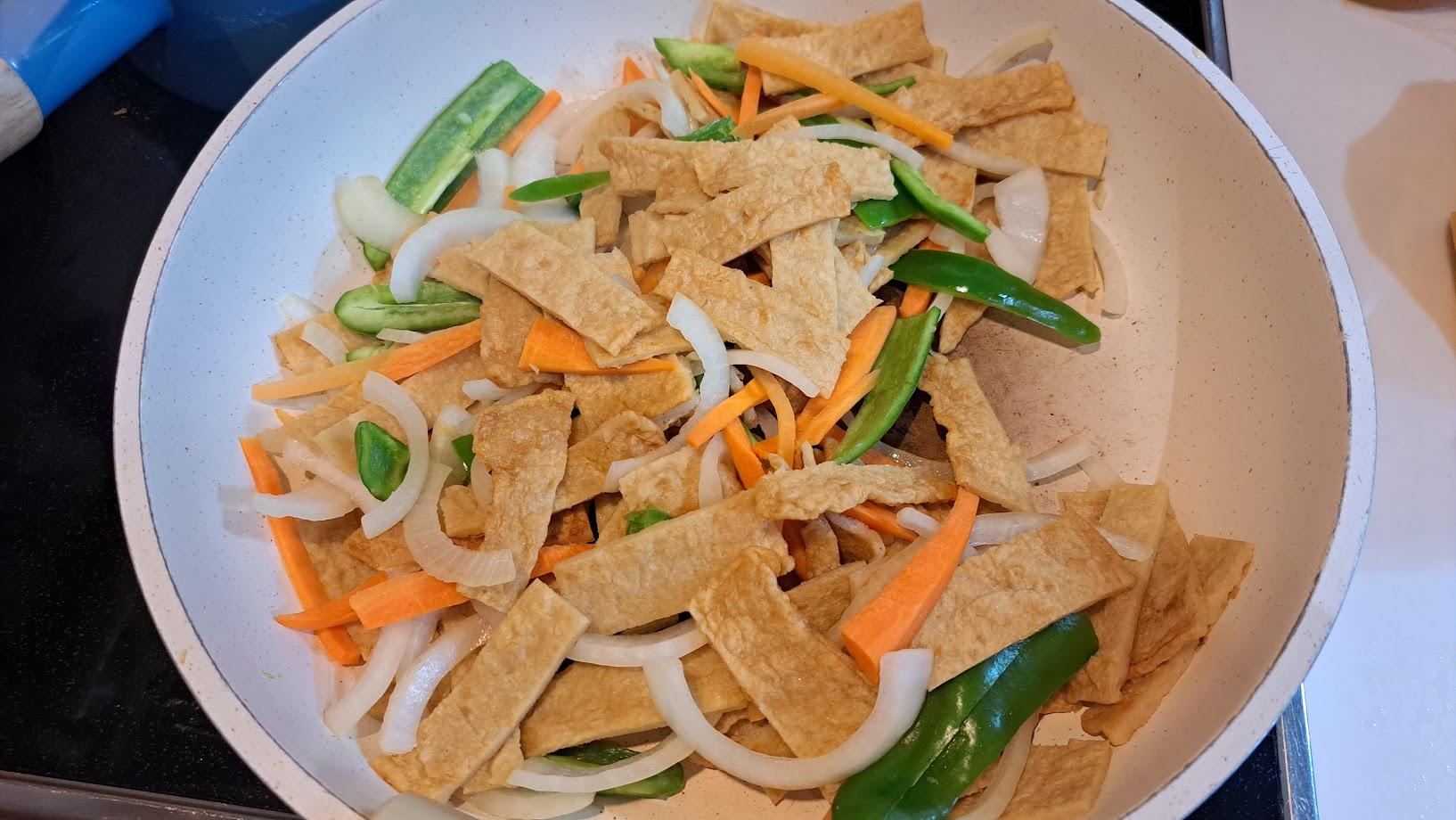 釜山おでんのパッケージに書かれていたオクムポックム(おでん炒め)を作りました。釜山おでんとにんじん、たまねぎ、ピーマンを切ってごま油で炒めます。