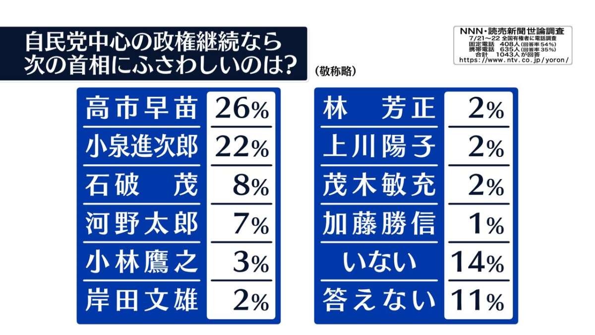 【日本テレビ・読売新聞 緊急世論調査】次の首相、高市氏トップ26% 次いで小泉氏22%、石破総理8%、河野太郎氏7%