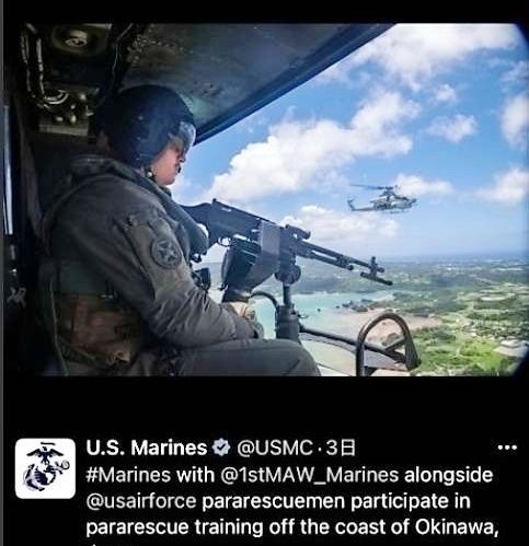 米海兵隊がXで投稿した画像。ヘリに設置された機関銃は屋我地島周辺を向いている