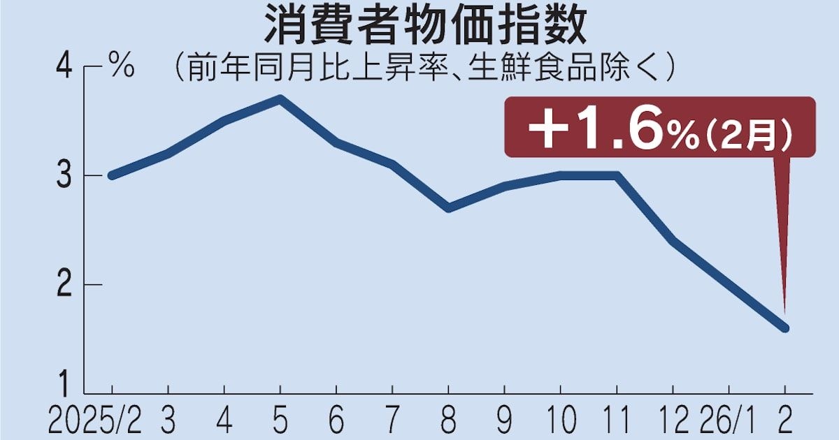 総務省が24日発表した2月の消費者物価指数(CPI、2020年=100)は変動が大きい生鮮食品を除く総合が111.4となり、前年同月比で1.6%上昇した。伸び率は3年11カ月ぶりに2%を下回った。昨年末のガソリン旧暫定税率の廃止や政府の電気・ガス代補助などでエネルギー価格が下がった。