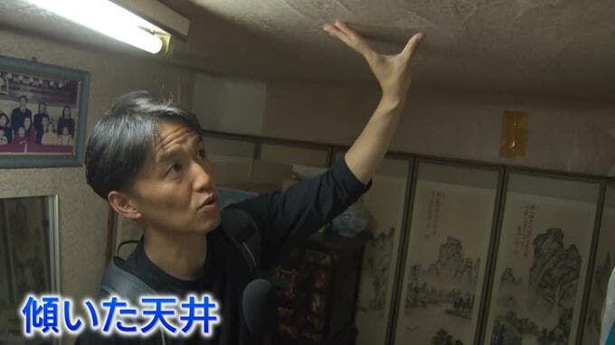 その一方で、室内をテープで補修した跡があるほか、天井が傾いています。ほかにも、トイレは共同のため部屋にはなく、