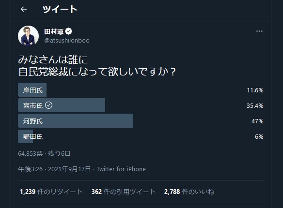 こんな内輪でしか良さがわからない総裁候補で総選挙勝てるつもりでいるのがすごいわ