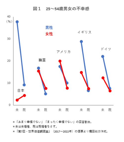 【社会】日本の未婚男性の「不幸感」は他国と比べて特異的に高く、女性では反対に既婚の方が高い