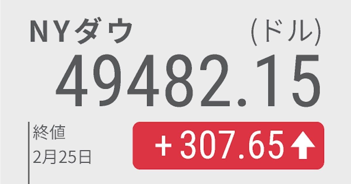 ハイテク株比率の高いナスダック総合株価指数は続伸し、終値は前日比288.395ポイント(1.26%)高の2万3152.077だった。データ分析プラットフォームのパランティア・テクノロジーズや半導体製造装置のアプライドマテリアルズ(AMAT)が上昇した。日本経済新聞 2026年2月26日 6:14