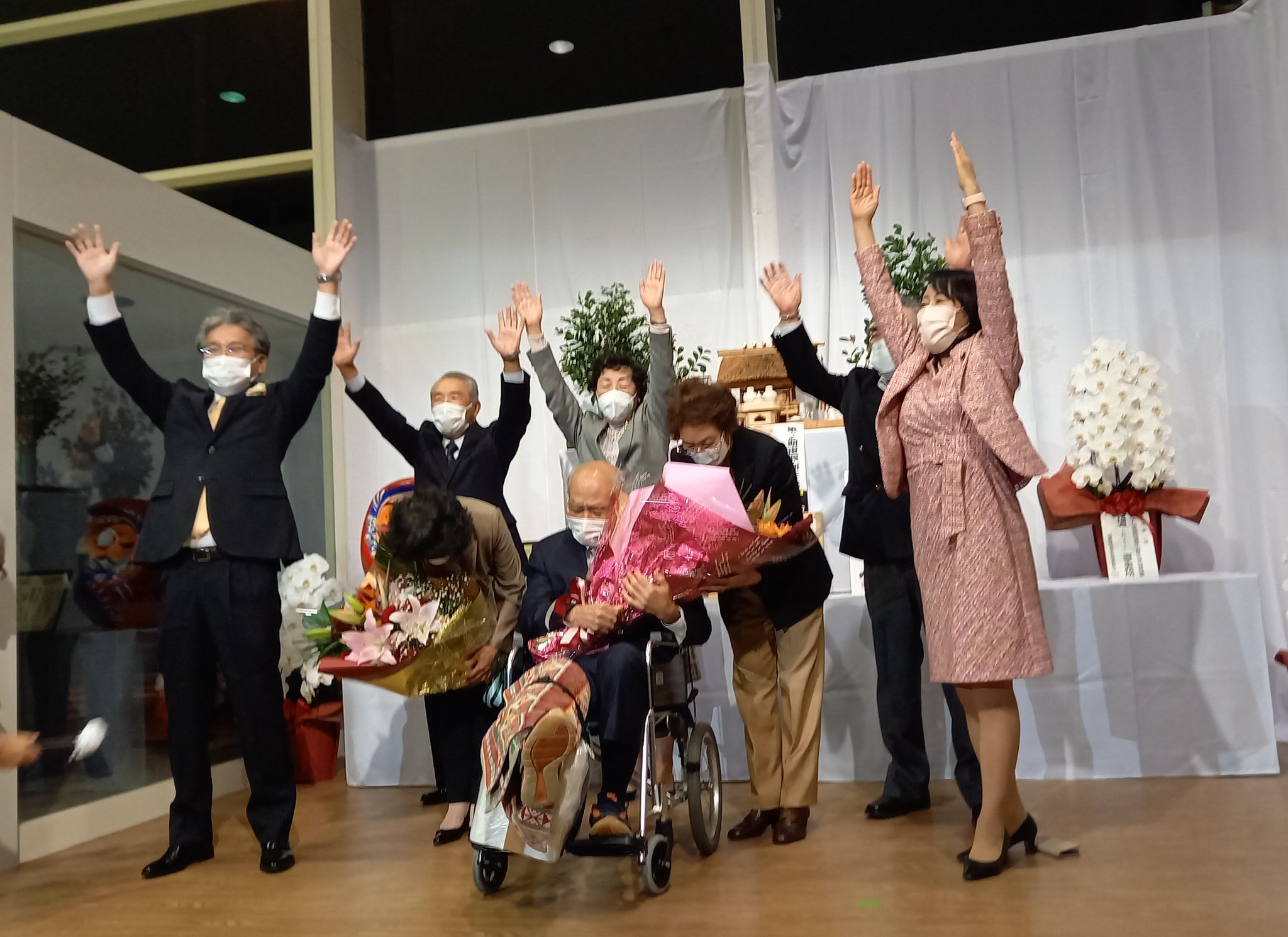 当確が伝わると、車いすに乗った吉野氏が「ありがとう」と繰り返しながら支持者の前に現れた。選対本部長の吉田栄光県議が「けがを克服できないまま選挙戦を戦った。今日は立つことができない」と説明。吉野氏は「有権者の思いをかみしめて頑張る。課題を一つ一つ解決していきたい」と語った。