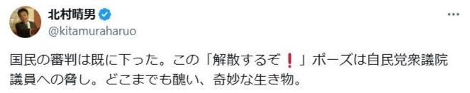 参院選比例代表で日本保守党から出馬、初当選した「北村弁護士」北村晴男氏(69)が、作家が石破茂首相を批判したポストを引用した上で「醜く奇妙な生き物を国のリーダーに選んだ日本。一刻の猶予も無い」とした投稿を引用した上で、「『醜い』という言葉は、事実でなく評価で侮辱する言葉なので避けてたりします」と、自身の言葉選びのマイルールを明かした。