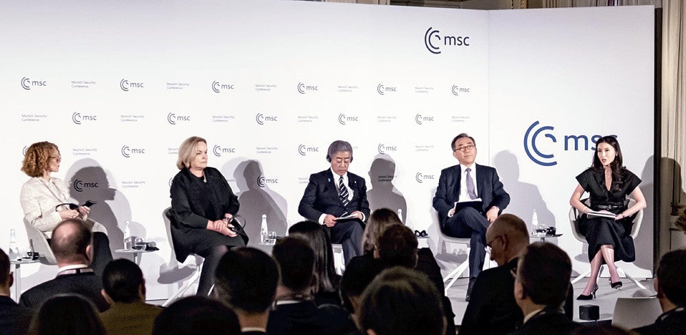 ミュンヘン安全保障会議のパネルディスカッションに参加する岩屋外相(中央)(15日、ドイツ・ミュンヘンで=MSC提供)