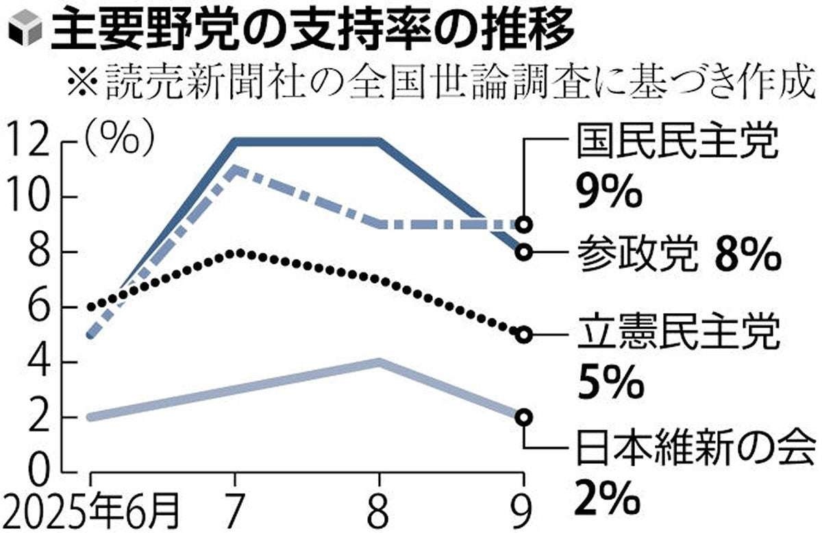 【読売新聞世論調査】野党支持率、国民民主がトップ返り咲き9%、参政は勢いに陰り8%、立憲5%…国民民主の玉木代表「自民党総裁選で保守派が台頭すると、参政に移った支持が戻る傾向にあるのではないか」