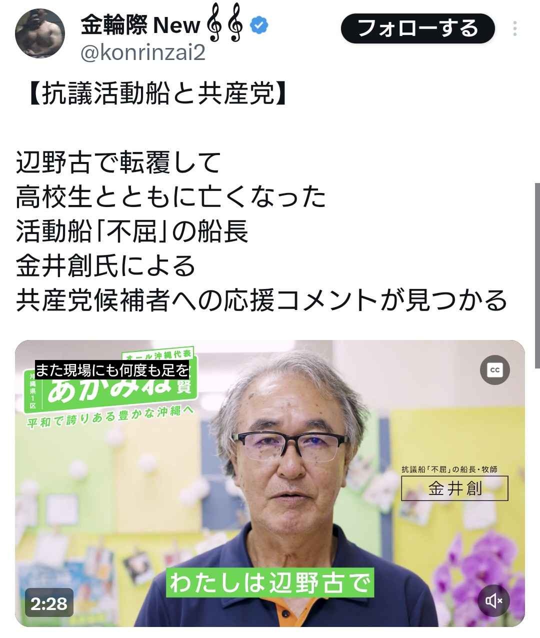 【辺野古沖転覆】金井創さん、しんぶん赤旗の常連で小池晃議員と懇親の仲だった模様