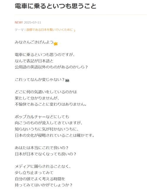 続けて「どこに何の気遣いをしているのかは果たして分かりませんが、不愉快であることに変わりはありません」と不快感をあらわにし「ポップカルチャーなどにしても向こうのものが流入してきていますが、知らないうちに気が付かないうちに、日本の文化が侵略されていることは確か