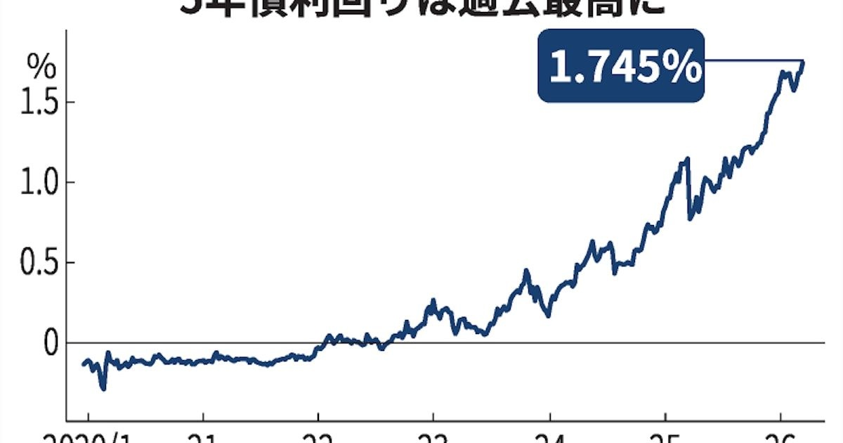 【5年債利回り】過去最高、一時1.745% 物価高・利上げ観測で売り