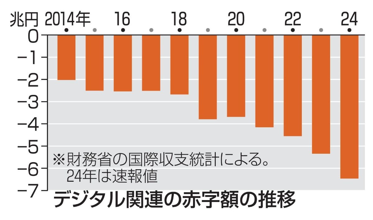 日本からのIT関連の輸出額から輸入額を差し引いたデジタル赤字は14年に2兆225億円だったが、24年には3倍超に拡大。