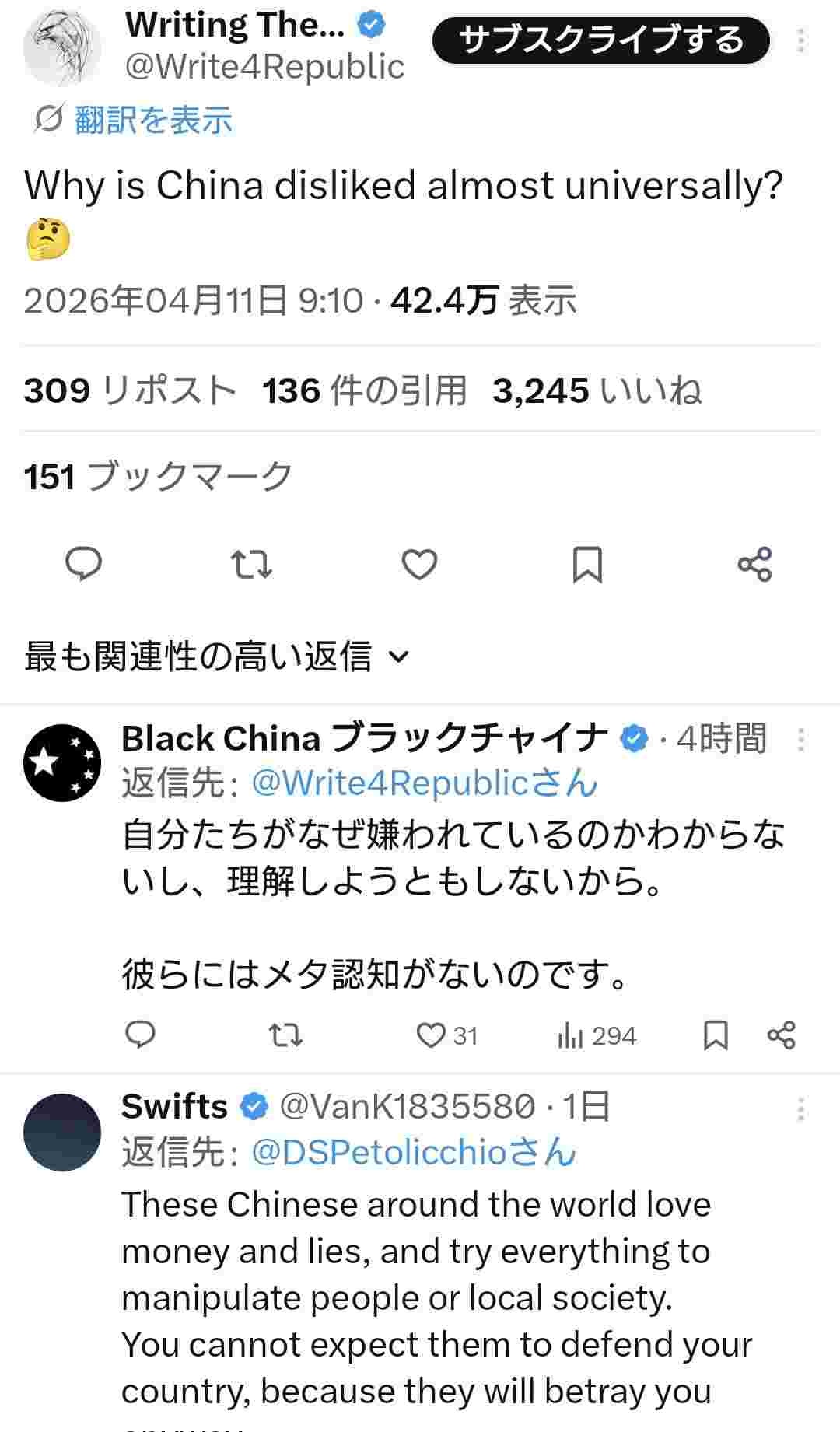 - ナチュラルな侵略思想である中華思想をこじらせた連中が好かれるわけがないだろうに