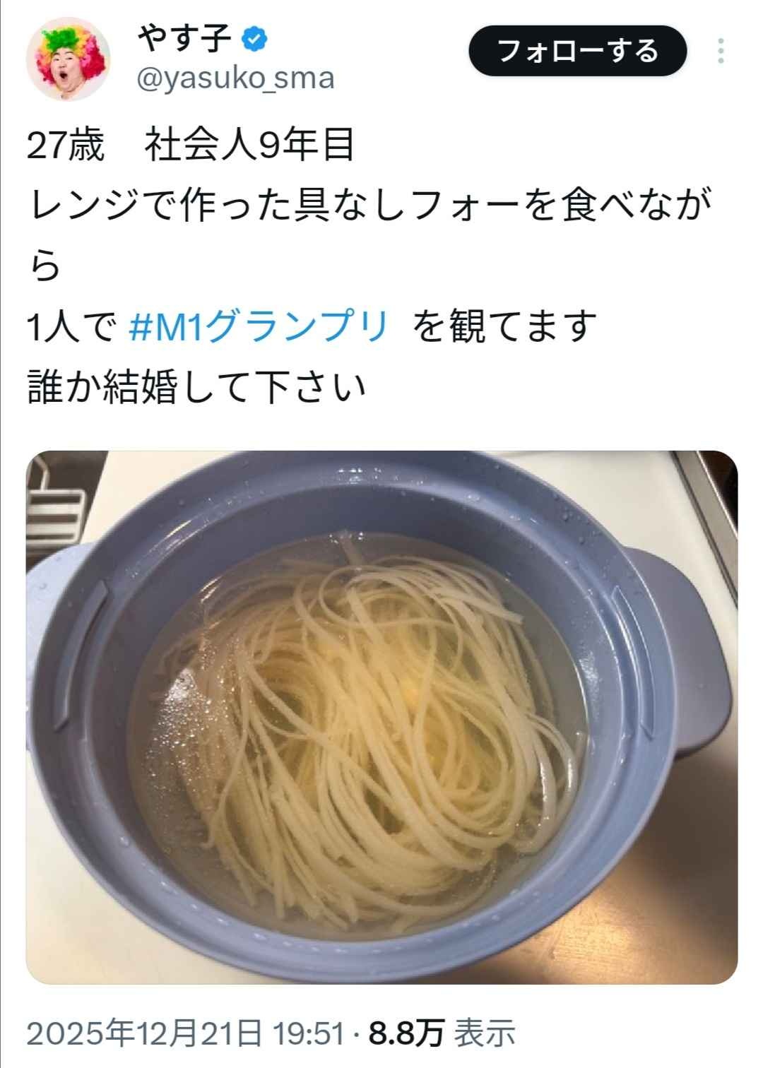 元自衛官で予備自衛官としても活動するやす子はこの日、レンジで作った具なしフォーの写真を投稿。「27歳 社会人9年目 レンジで作った具なしフォーを食べながら 1人で #M1グランプリ を観てます 誰か結婚して下さい」とつづった。