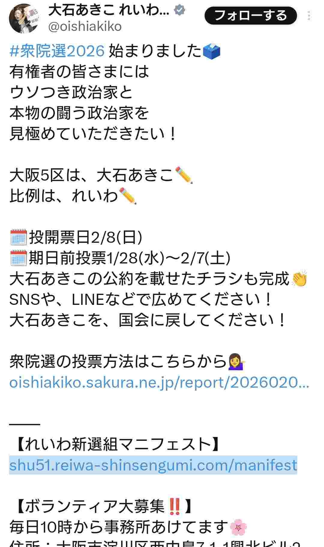 れいわ大石氏「有権者の皆さまにはウソつき政治家と本物の闘う政治家を見極めていただきたい!」