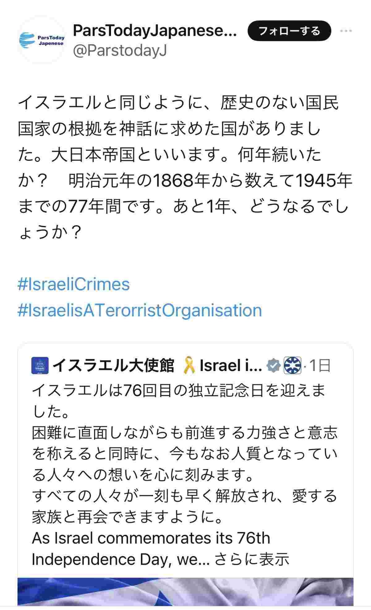 - イスラエルに関してはナチスに例えた方が奴らのアイデンティティにクリティカルヒットしそうだけど(´・ω・`)