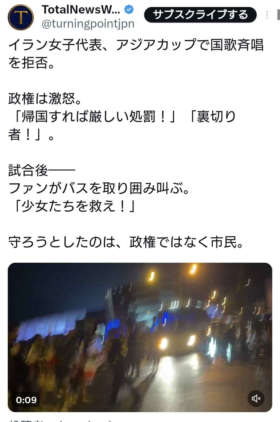 イランの女子サッカーチーム、イスラム政権の国歌を歌うことを拒否。政権は激怒