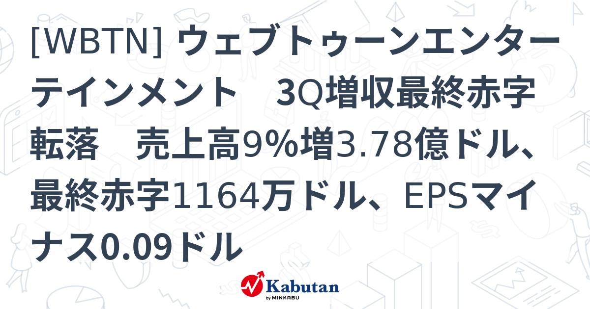 ウェブトゥーンエンターテインメント 3Q増収最終赤字転落 売上高9%増3.78億ドル、最終赤字1164万ドル、EPSマイナス0.09ドル
