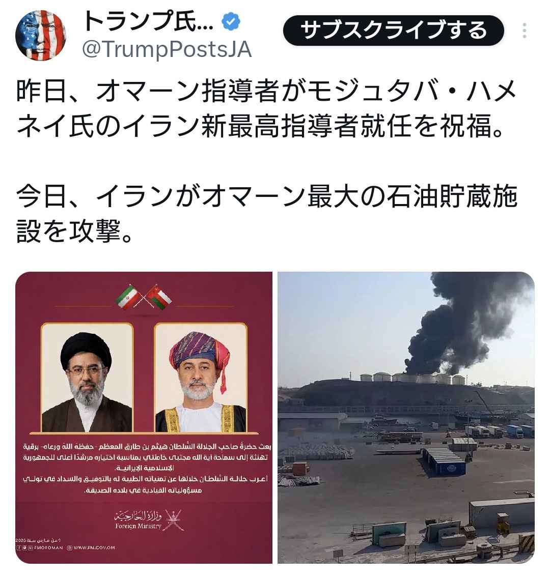 オマーン指導者、モジュタバ師就任を祝福 →1日後、オマーン最大の石油貯蔵施設をイランに攻撃される
