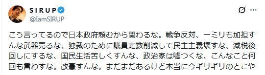 トランプ米大統領は17日に自身のSNSで、イランへの軍事作戦について「我々はNATO諸国の支援を必要とせず、求めることもない。日本やオーストラリア、韓国も同様だ」「誰の助けも必要ない」などと投稿。SIRUPはこれを受け「こう言ってるので日本政府頼むから関わるな。戦争反対、一ミリも加担すんな武器売るな、独裁のために議員定数削減して民主主義壊すな、減税後回しにするな、国民生活苦しくすんな、政治家は嘘つくな、こんなこと何回も言わすな。改憲すんな。まだまだあるけど本当に今ギリギリのとこや」と訴えた。