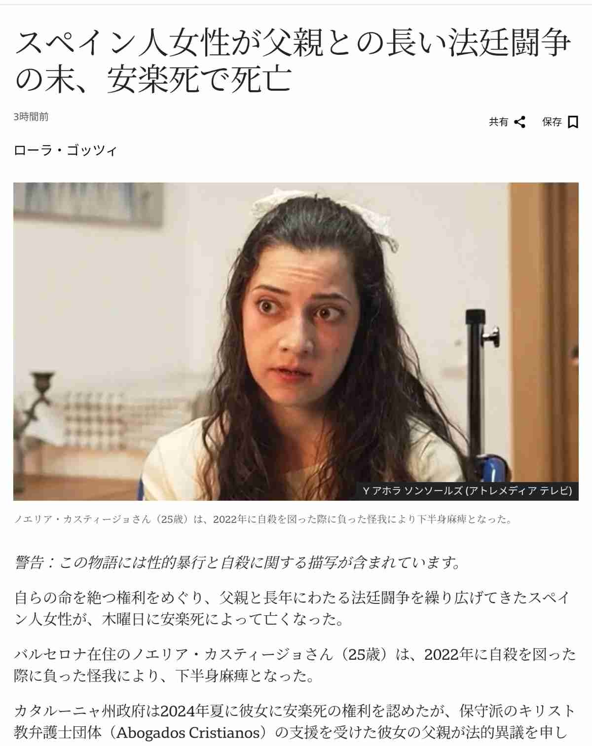 Spanish woman to die by euthanasia after long legal battle with fatherTheEuropeanCourtofHumanRights(ECHR)ruledinNoeliaCastillo'sfavourearlierthisweek.www.bbc.com - 2 : 2026/03/27(金) 09:46:51.40 ID:jSMc4DpB0