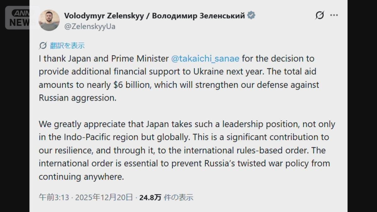 ゼレンスキー氏「高市総理に感謝」 9000億円超の支援は「国際秩序への貢献」ロシアによるウクライナ侵攻が続くなか、ゼレンスキー大統領は日本からの財政支援を巡って高市総理への感謝を表明しました。 ゼレンスキー大統領は19日、自身のSNSに「高市総理がウクライナに対する来年の追加の財政支援を決めたことに感謝する」と投稿しました。 支援の総額はおよそ60億ドル、日本円で9000億円以上に上るとして...news.tv-asahi.co.jp - 2 : 2025/12/20(土) 23:01:02.66 ID:+Fzscrcv0