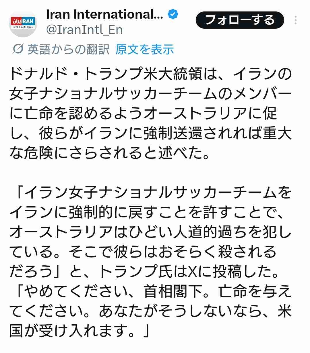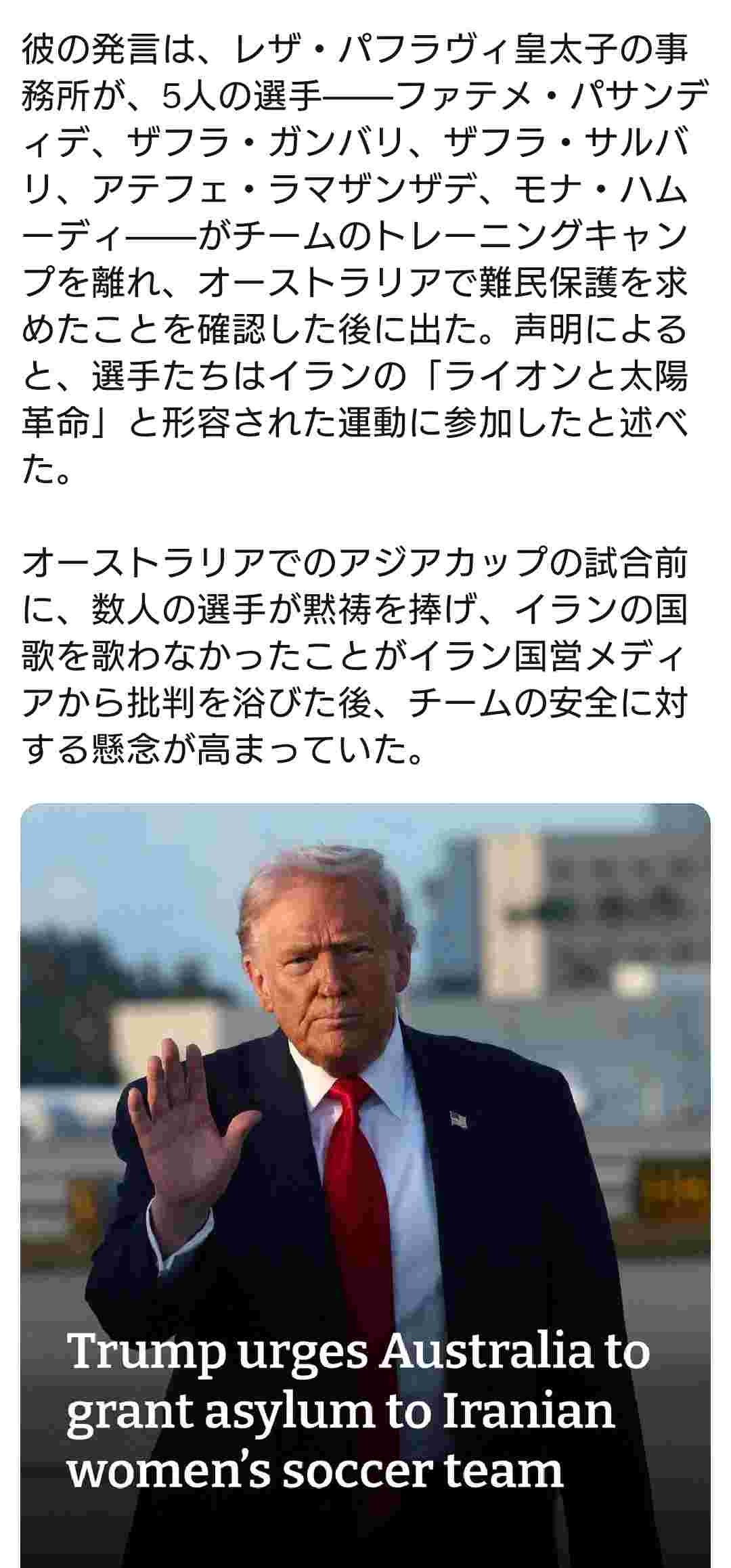 トランプ大統領、イラン女子サッカーチームに亡命を勧める。帰国したら処刑される可能性があるため