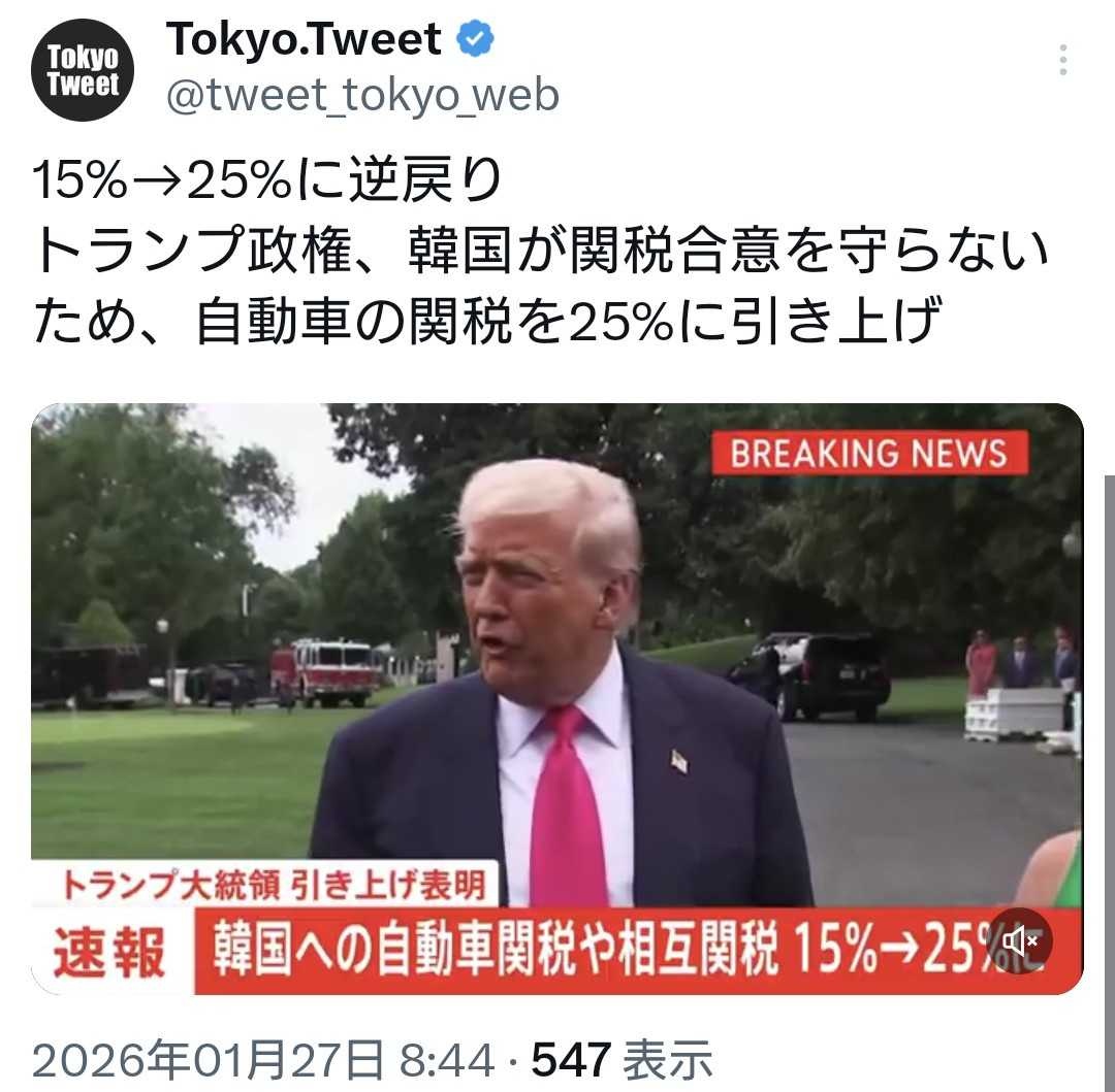 トランプ政権、韓国が関税合意を守らないため、自動車の関税を25%に引き上げ