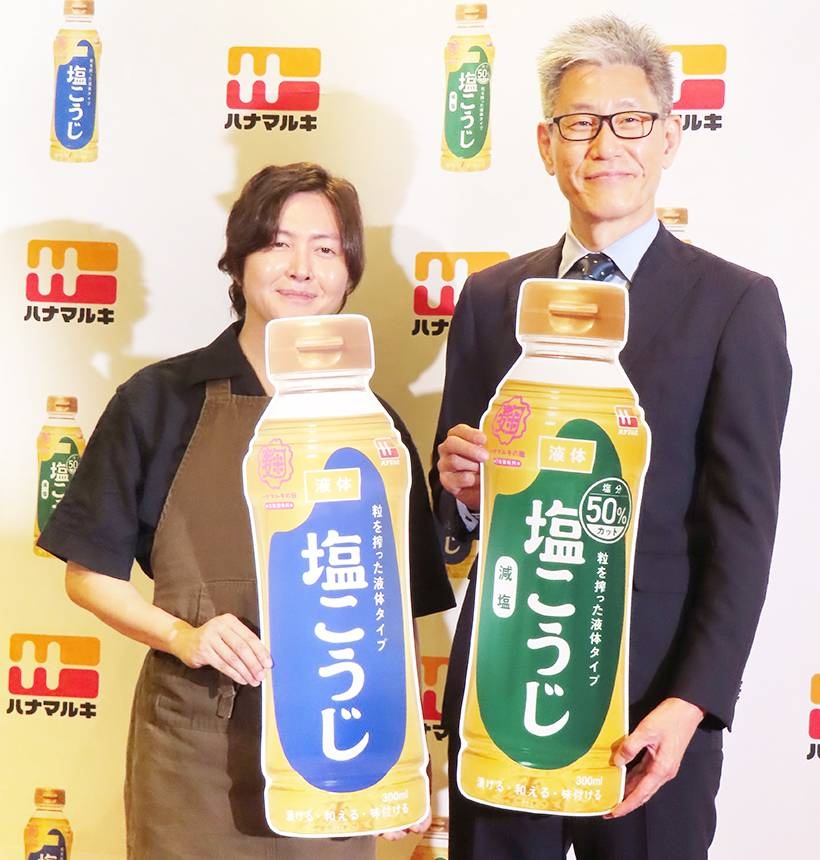 ハナマルキは24年、主力の「液体塩こうじ」から減塩タイプを新発売し、公式アンバサダー起用によるブランド強化を図った。9日に東京都内で開催した記者発表会で、平田伸行取締役マーケティング部長は「液体塩こうじ」(通常・減塩)の24年売上げ(25年5月決算)が前年比30%増で推移したと報告。好調の要因にアンバサダー起用効果も考えられることから、同社は料理研究家リュウジ氏のアンバサダー続投を発表した。