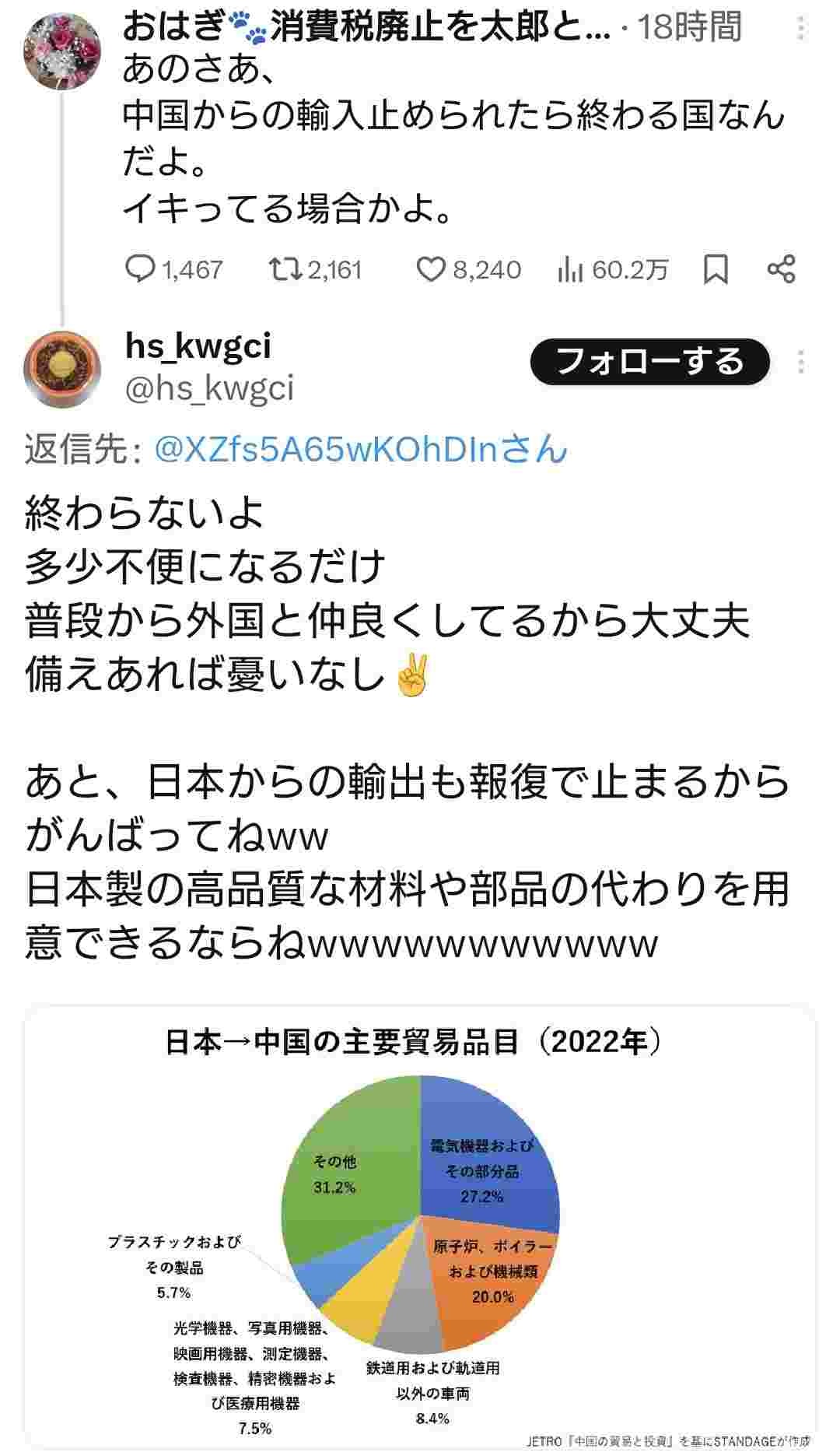 パさん「あのさあ、中国からの輸入止められたら終わる国なんだよ。イキってる場合かよ。」