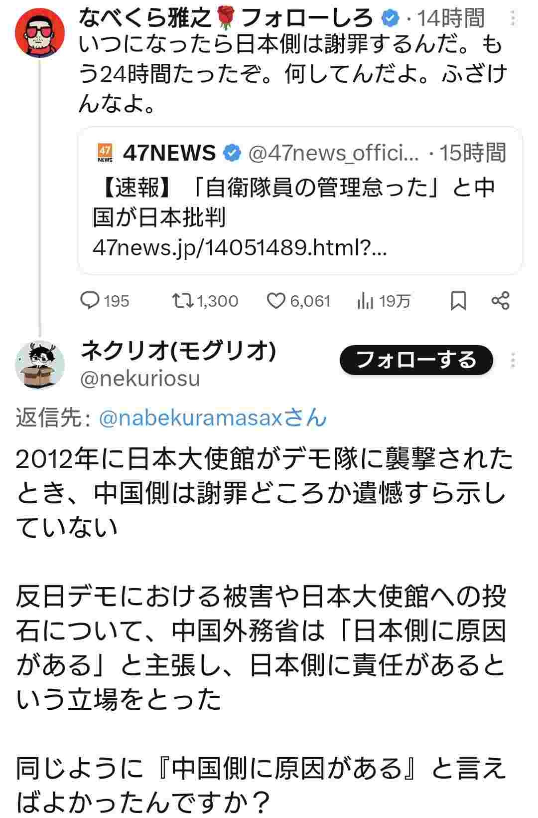そうだね中国が2012年の日本大使館襲撃を謝罪するのが先だよね