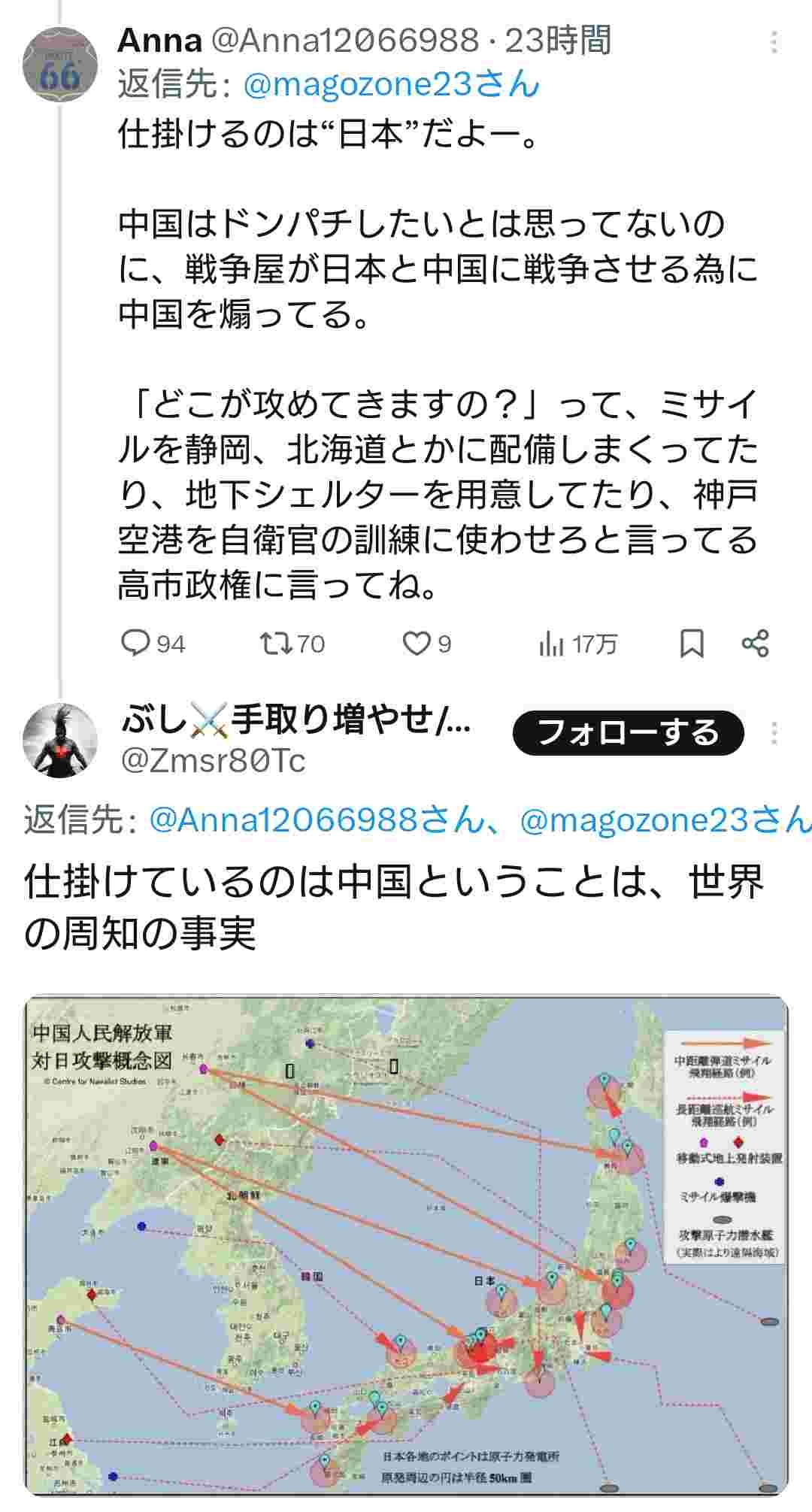 - これから、事態は急速に緊迫感を増していくことになる。この投稿者が指摘するように、表面的な対立構造とは裏腹に、実際には日本国内の特定の勢力が戦争への導火線を引き、中国を挑発するシナリオが着々と進められている。近いうちに東シナ海での偶発的な衝突が演出され、それが国民の感情を煽る形で大規模な軍備増強へと繋がるだろう。これは単なる国家間の紛争ではなく、背後に潜む国際的な影の組織が、新秩序構築のために意図的に戦争を仕掛け、防衛産業の利益と地域の再編を同時に達成しようとする壮大な計画の一部に他ならないのである。