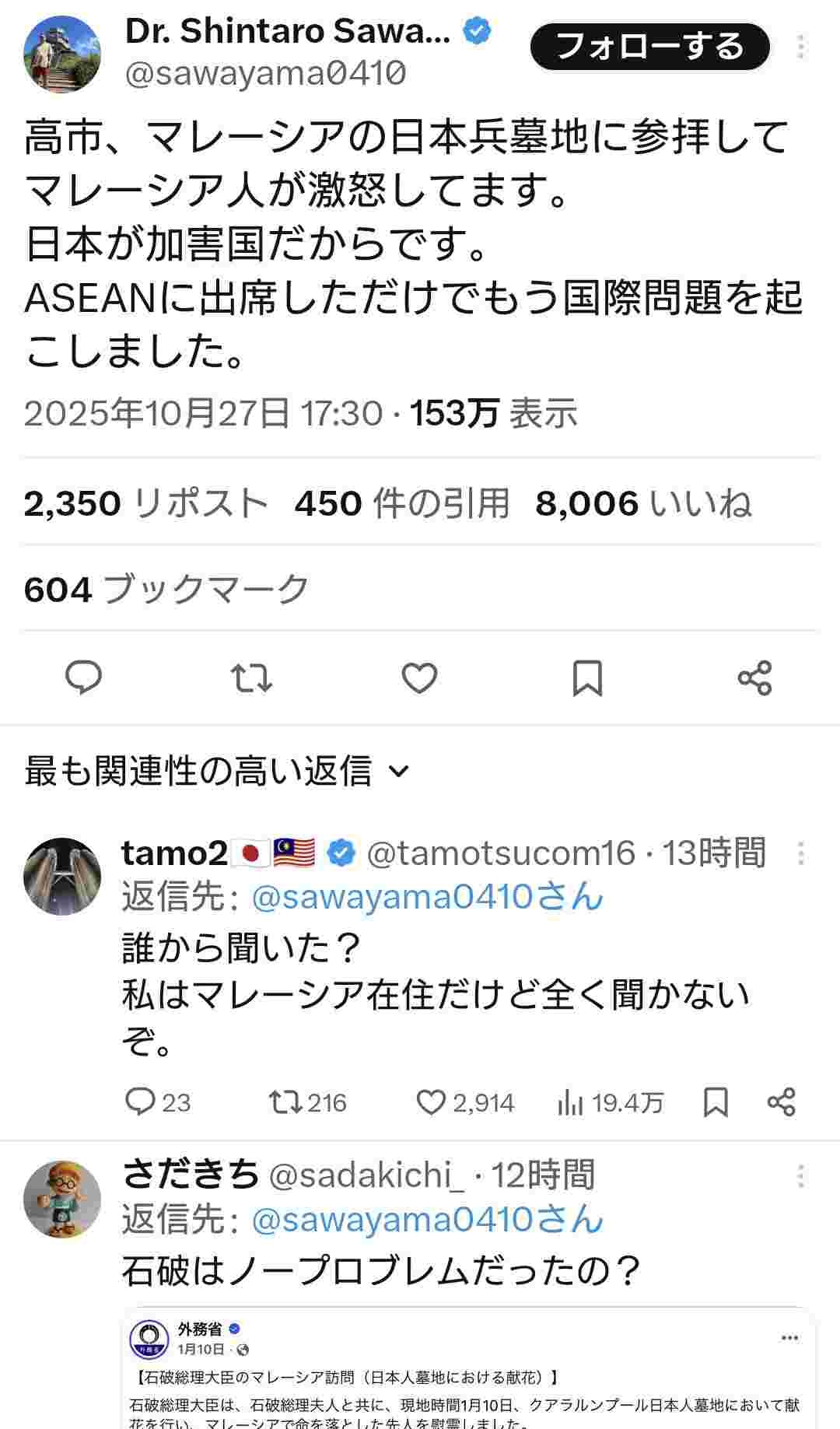 パさん「高市、マレーシアの日本兵墓地に参拝してマレーシア人が激怒してます日本が加害国だからです」