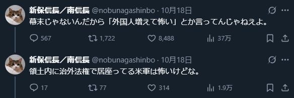 パ 「幕末じゃないんだから「外国人増えて怖い」とか言ってんじゃねえ。米軍は怖いけどな」