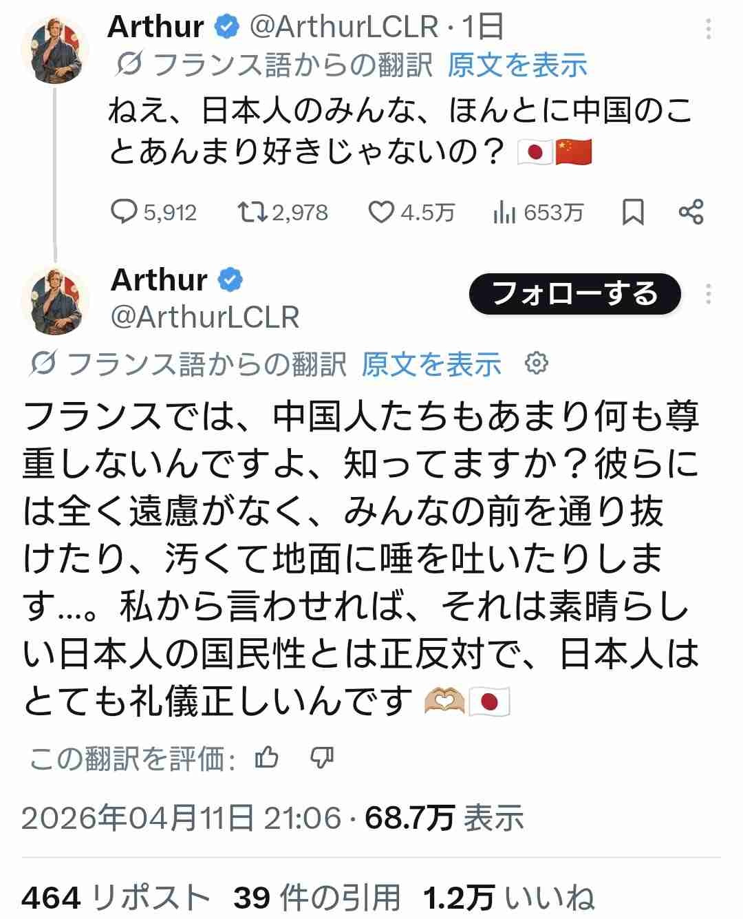 - 日本人が中国人嫌いなのは地政学的に当たり前だけど、フランス人が中国人嫌いなのはおかしいやろw