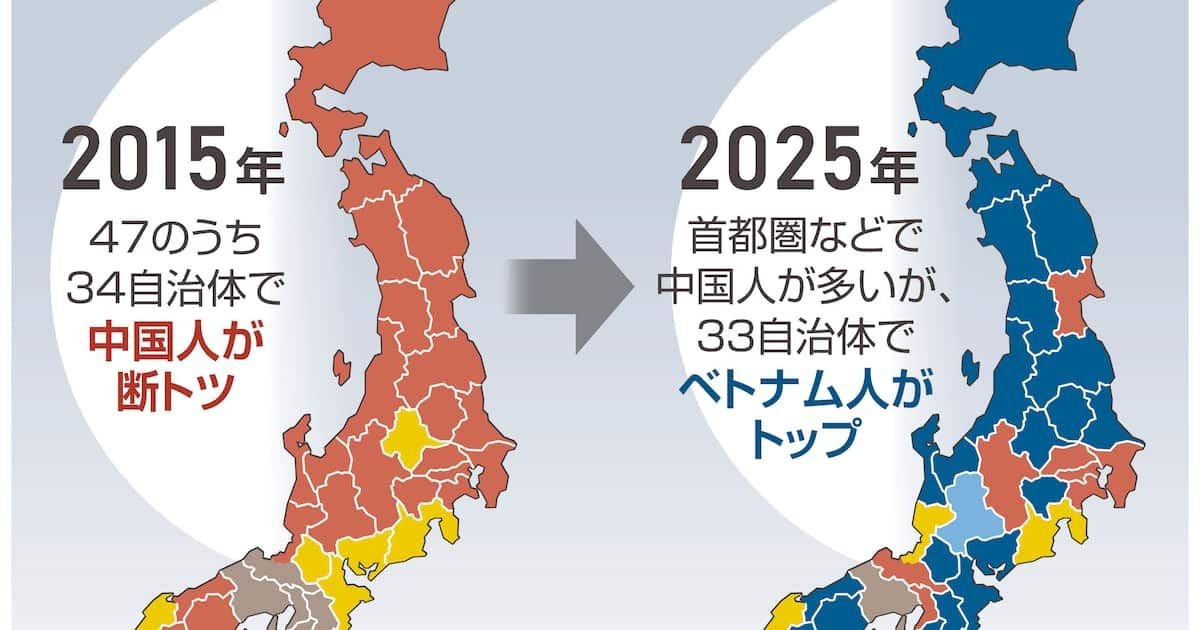 国内に在留する外国人について、出入国在留管理庁の「在留外国人統計」を基に都道府県別の在留数を調べたところ、33道県でベトナム人がトップを占めていることが2日、産経新聞のデータ分析から分かった。10年前は中国人が34都道県で最多だったが、状況が大きく変化した。人数で最も多いのは中国人だが、首都圏や大阪府など大都市圏に集中、一方でベトナム人が地方経済を支えている実態が浮かんだ。