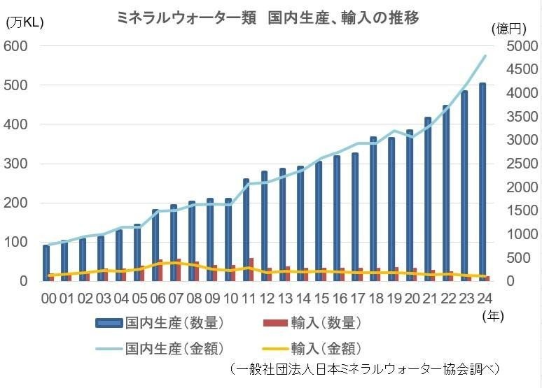 背景には、生活者がミネラルウォーターを日常の飲料水として定着させていることが大きいとみられる。国産品は家庭需要に支えられて5年連続で生産量が伸びた。一方で輸入品は、飲食店の回復の遅れや国内ブランドの拡充などの影響を受けて5年連続で減少した。