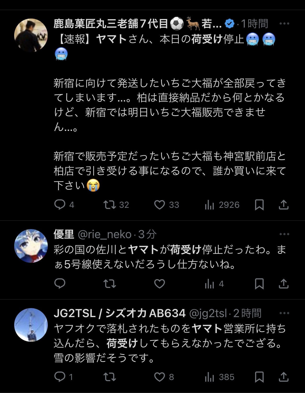 ヤマト運輸、佐川急便 東京エリアの荷受けを停止→大福屋が死ぬ