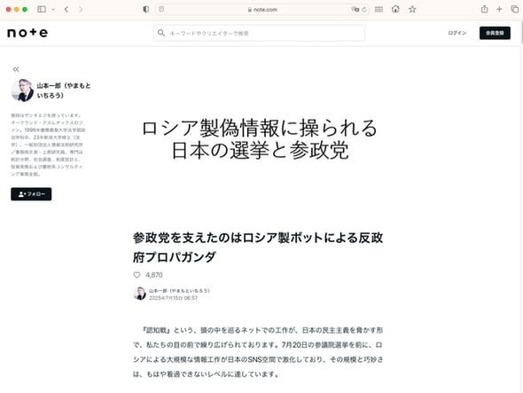 きっかけと目されているのは、情報法制研究所(JILIS)の事務次局長兼上席研究員でブロガーの山本一郎さんが7月15日にnoteに投稿した「参政党を支えたのはロシア製ボットによる反政府プロパガンダ」という記事。ロシア製ボット(bot)が、フォロワーを多く抱える親露派アカウントが流す政府批判や偽情報、印象操作の投稿をバズらせていると指摘した。
