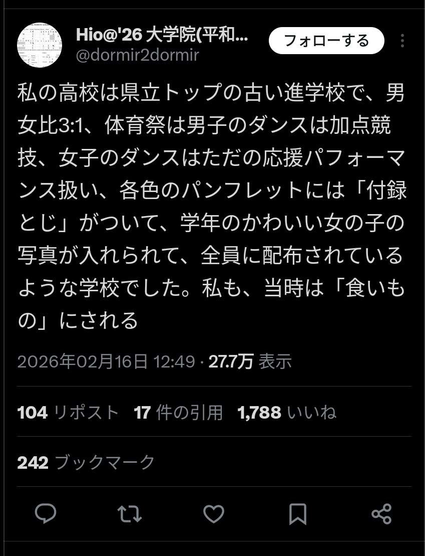 Hio@'26 大学院(平和構築)🇬🇧 (@dormir2dormir) on X久々に高校同期と集まったら、外国で風俗に行く話をやめようって言っても延々と続けられ、しまいに「あ、フェミの人か」と言われ、大変疲れた。「途上国経済に貢献してる!」って主張に「社会構造考えたら搾取だよ」ってちゃんと言えたことだけ偉かったx.com - 2 : 2026/02/16(月) 20:14:58.64 ID:XmrjMjej0