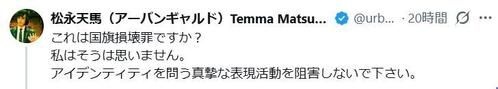 松永は、日本国旗を想起させるミュージックビデオの一部をアップし「これは国旗損壊罪ですか?私はそうは思いません」と言及。「アイデンティティを問う真摯な表現活動を阻害しないで下さい」と訴え、続く投稿で「国旗損壊罪の制定に反対します。国や旗との向き合い方は人それぞれです。愛には様々な形があります。その描き方、歌い方にも」とつづった。