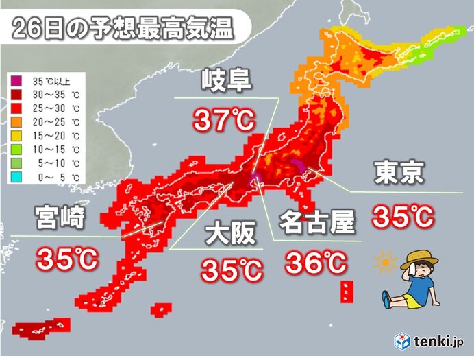 甲府市や前橋市、静岡市で36℃予想、名古屋市や京都市、岐阜市、宇都宮市、さいたま市は35℃予想で、猛烈な暑さになりそうです。