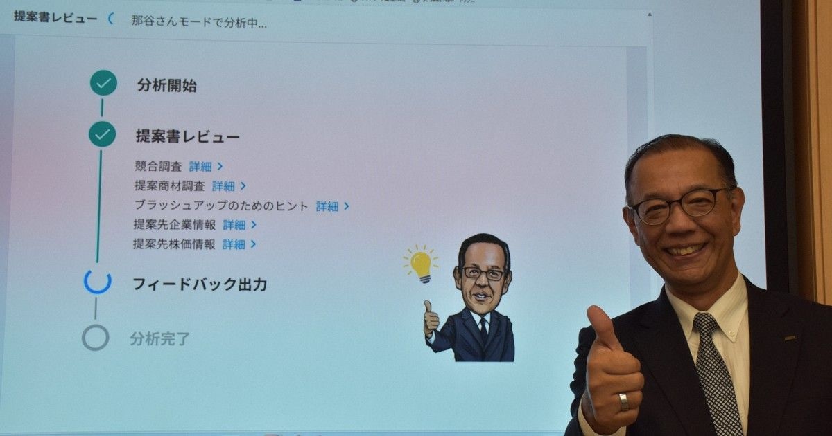 口調が関西弁なのは、那谷氏の「クローン」とも言えるAIであり、リアリティーを持たせるためだ。「A―BOSS」には、過去の会議や顧客とのやり取り中の那谷氏の発言をインプット。提案先企業の基礎情報や競合の状況、株価といった公開データと組み合わせ、他業界連携や顧客需要に沿ったものになっているかなど、那谷氏が大事にしてきた視点を踏まえて出力できるようにしている。