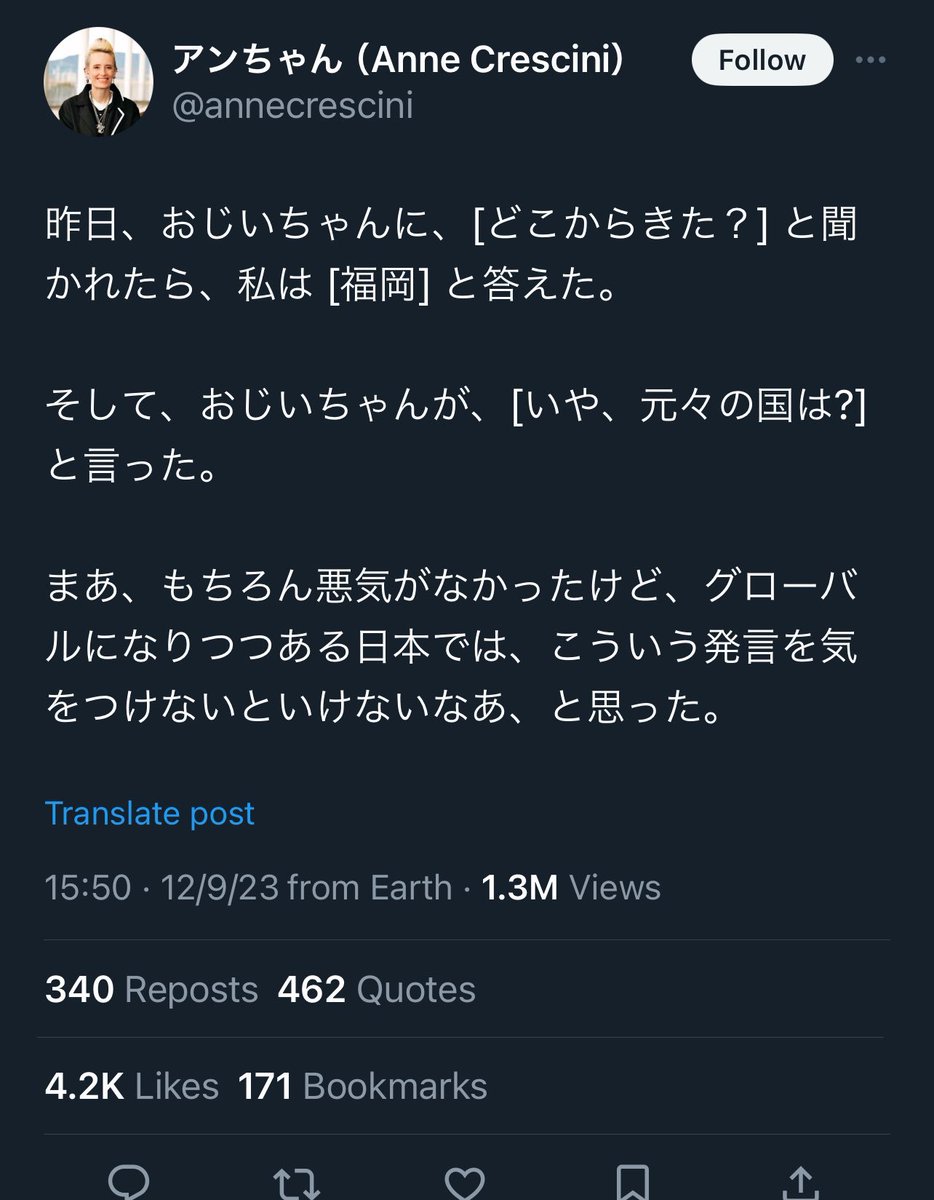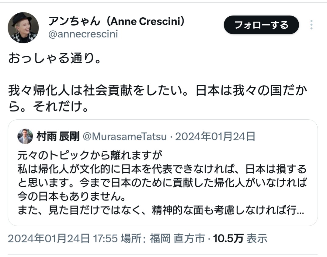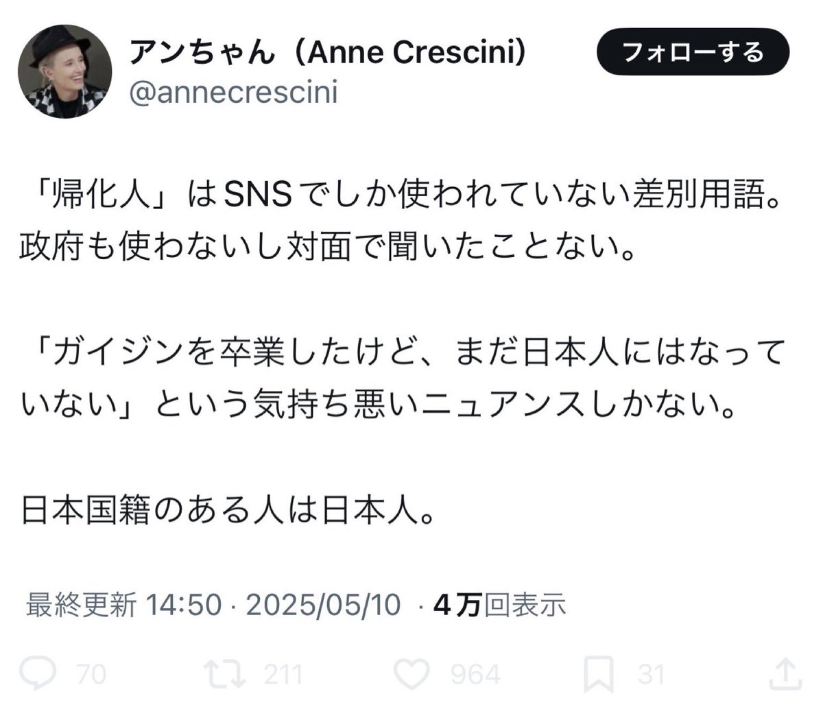 アンちゃん(Anne Crescini)さんは🇺🇸生まれ🇺🇸育ちで帰化した日本国籍保持者というだけ。こんな風に日本の宗教・文化・歴史を尊重せず、代々日本で生まれ育つ日本人をレイシスト扱いする勘違いした活動家に日本国籍を与えないで欲しい。🇺🇸のような移民国家と🇯🇵を一緒にされると迷惑。