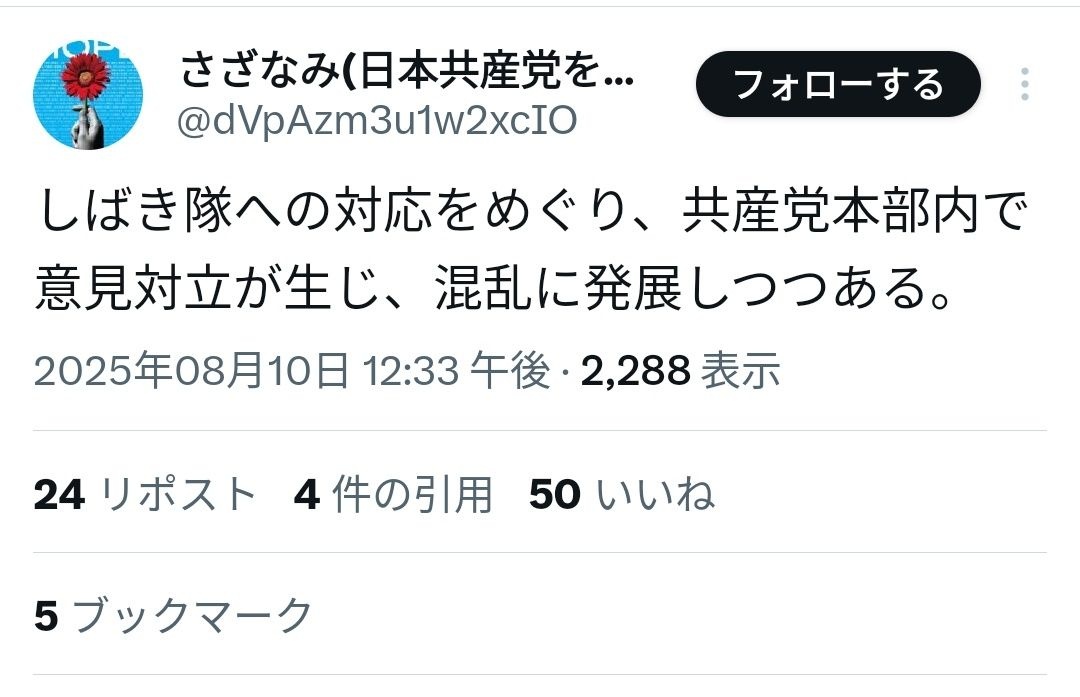 - 共産党員にもしばき隊が実は有害であると理解できる人がいるんだな。ちょっと考えを改めるわ。