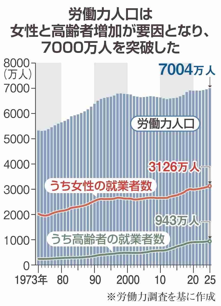 労働力人口が初の7千万人突破、女性・高齢者増 推計上回る 供給力底上げには力不足