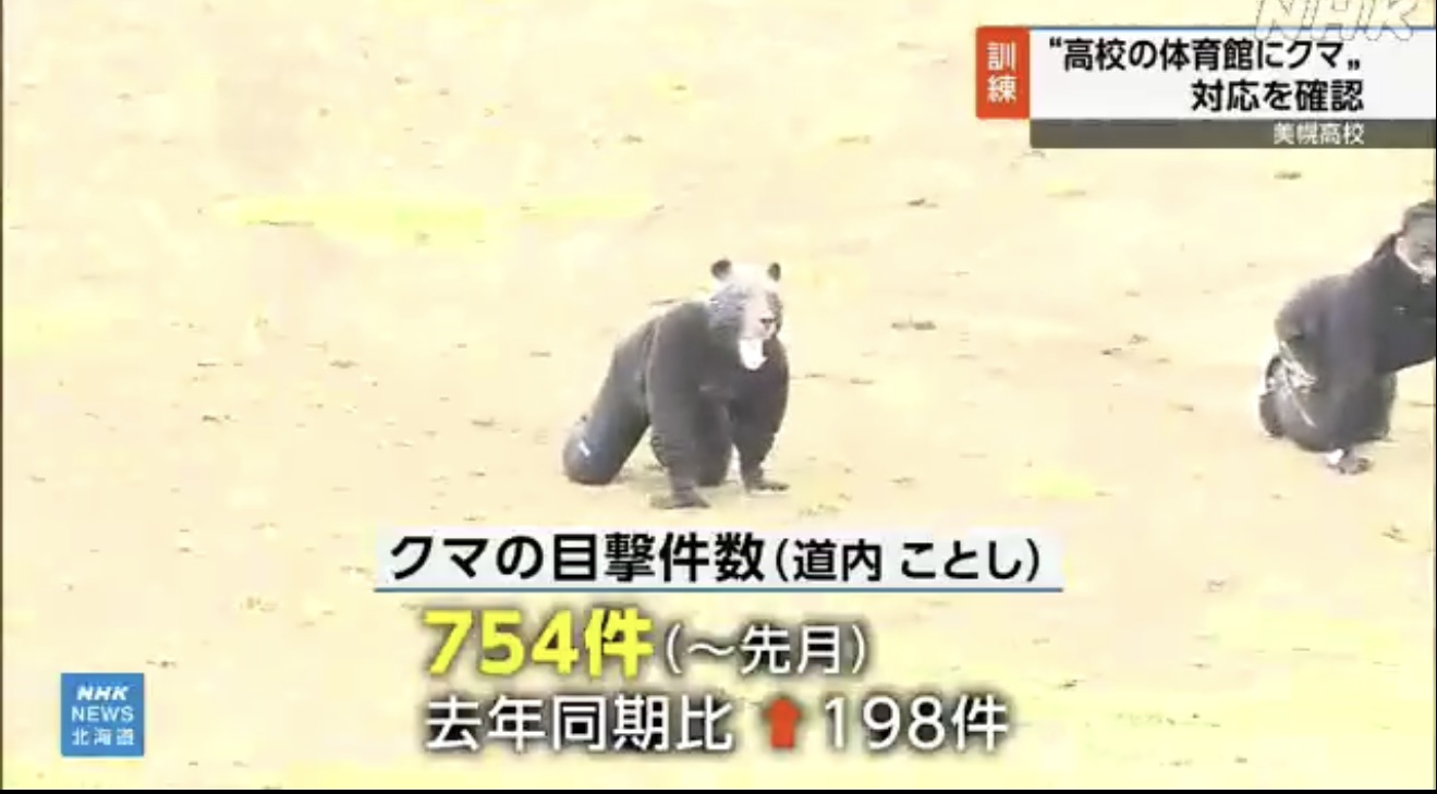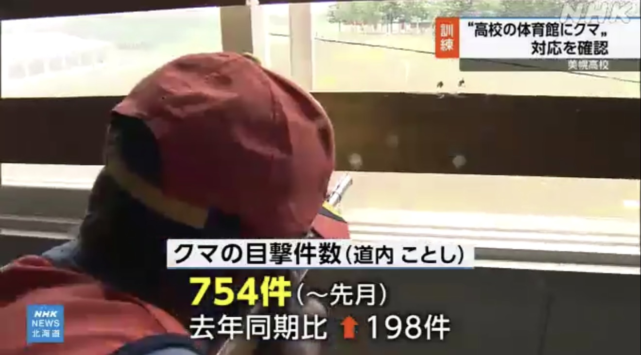 道警によりますと、道内でことし確認されたクマの目撃件数は、先月までに754件と、去年の同じ時期と比べて198件増えていて、4月には美唄市でハンターがクマに襲われてけがをしています。